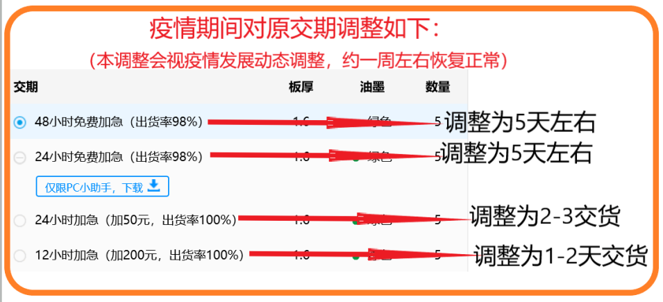 三:限單政策:為確保樣板訂單,小批量全面開啟限單政策,限單政策隨時動態(tài)調(diào)整,視嘉立創(chuàng)各工廠開工及員工到廠情況而定