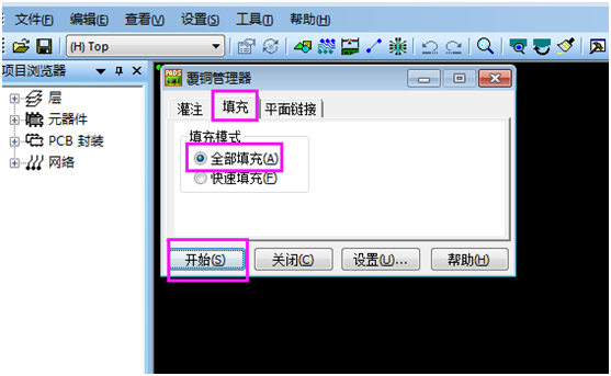 進(jìn)入到敷銅管理器后會(huì)出現(xiàn)下圖對(duì)話框,請(qǐng)一定要選擇填充(hatch)