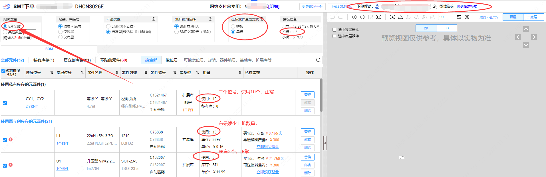 拼板: 如【坐標文件生產(chǎn)方式】選對了,刷新后使用數(shù)量還是錯的,注意【拼板】是否對,如【拼板】后面的拼板方式與PCB實際拼板方式不符。 請聯(lián)系匹配界面右上角的【下單幫助】人員