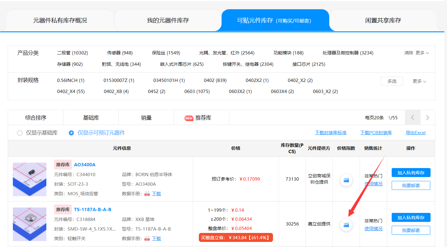 為了指導客戶更好的做好”整盤私有庫存?zhèn)湄洝?/span>,提供采購數(shù)據(jù)依據(jù),嘉立創(chuàng)SMT元器件上線“嘉立創(chuàng)價格指數(shù)” 以方便客戶