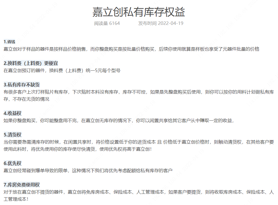 一、客戶通過預訂的器件,如有多出的器件使用不完可以在嘉立創(chuàng)發(fā)布閑置,不用擔心器件會過期。對于熱門的物料如市場上缺貨,還可以加價發(fā)布閑置。備貨私有庫存有很多權益。權益如下: