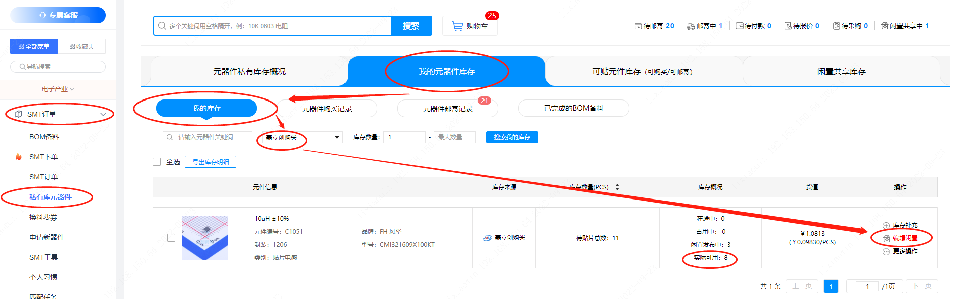 第一步:在【私有庫元器件】--【我的元器件庫存】--【我的庫存】內“庫存來源”處選“嘉立創(chuàng)購買”后可以查看庫存總數(shù)。如有多出可點擊“編輯閑置”按鈕。