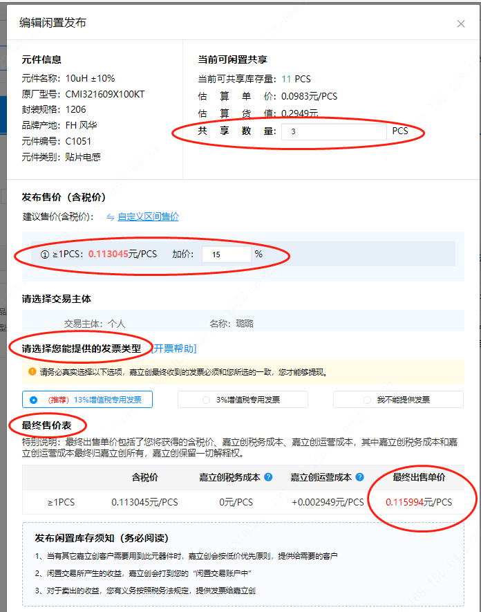 第二步:點擊后會顯示編輯閑置發(fā)布頁面框,可以看到器件參數(shù)等信息,您輸入共享數(shù)量、加價比,并選擇您能提供的發(fā)票類型(選擇后會出現(xiàn)最終出售單價),閱讀《發(fā)布閑置庫存須知》并勾選,而后點擊“確定發(fā)布”。