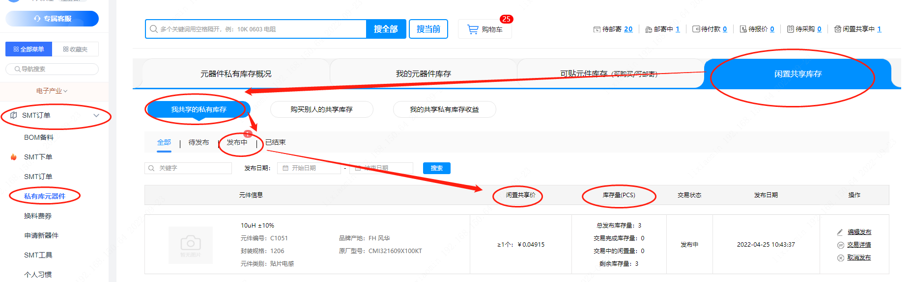 第三步:若您想查看所發(fā)布的共享庫存器件,點擊【私有庫元器件】--【閑置共享庫存】--【我共享的私有庫存】--【發(fā)布中】即可,可以看到庫存量、閑置共享價等等信息。