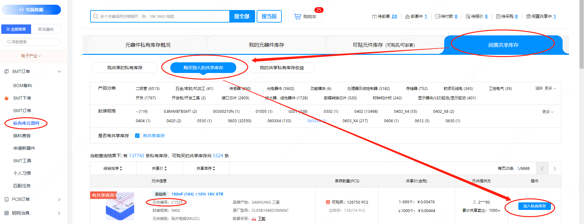 點擊【私有庫元器件】--【閑置共享庫存】--【購買別人的共享庫存】,找到您需要的器件,點擊“加入私有庫存”即可。