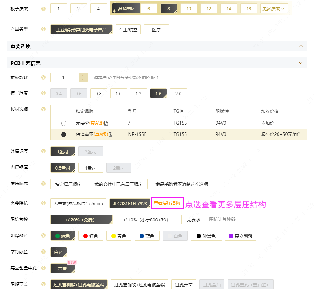 目前系統(tǒng)已開通4-32層的多層板制作,更多的層壓結(jié)構(gòu)請在系統(tǒng)中查看: