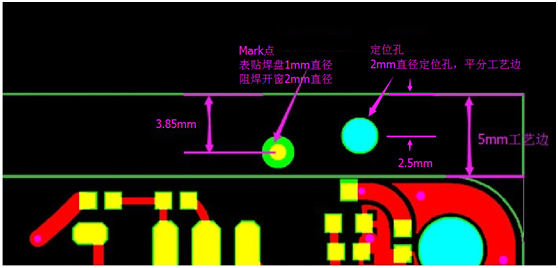 工藝邊常規(guī)一般是5mm寬度,定位孔是2mm的直徑 光學(xué)定位點一般是1mm直徑表貼焊盤。如您要3mm或4mm定位孔麻煩加寬工藝邊,要考慮加完孔后是否有懸空位避免斷工藝邊。