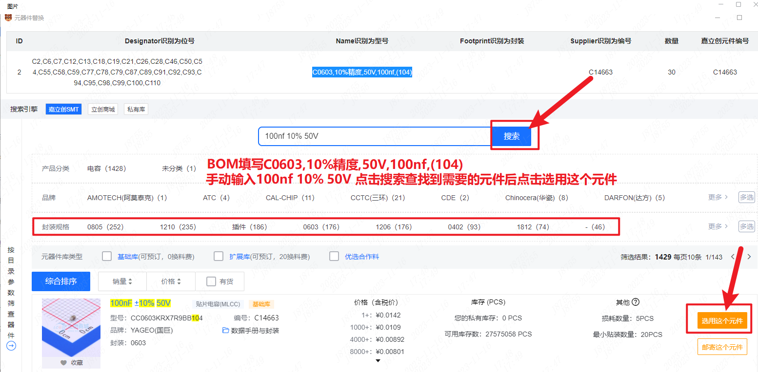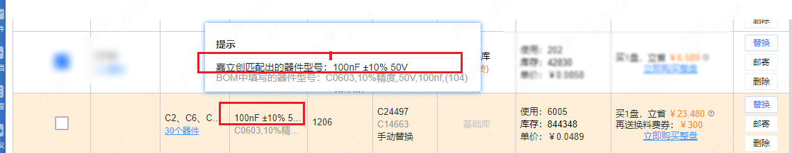 一區(qū):所有匹配成功的器件,需要客戶對(duì)匹配好的型號(hào)進(jìn)行檢查、確認(rèn)后才可以下單,黑色字體是嘉立創(chuàng)最終要貼的;