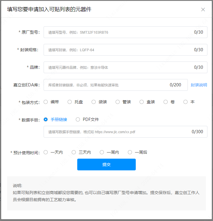 2.如圖所示,填寫好器件的原廠型號、封裝規(guī)格、品牌、包裝方式以及封裝數(shù)據(jù)資料(做封裝庫需要)后,選擇預(yù)計使用時間后,即可點擊【提交】申請。