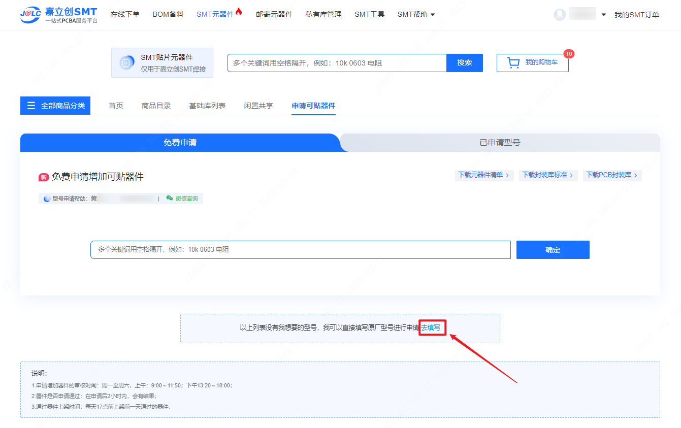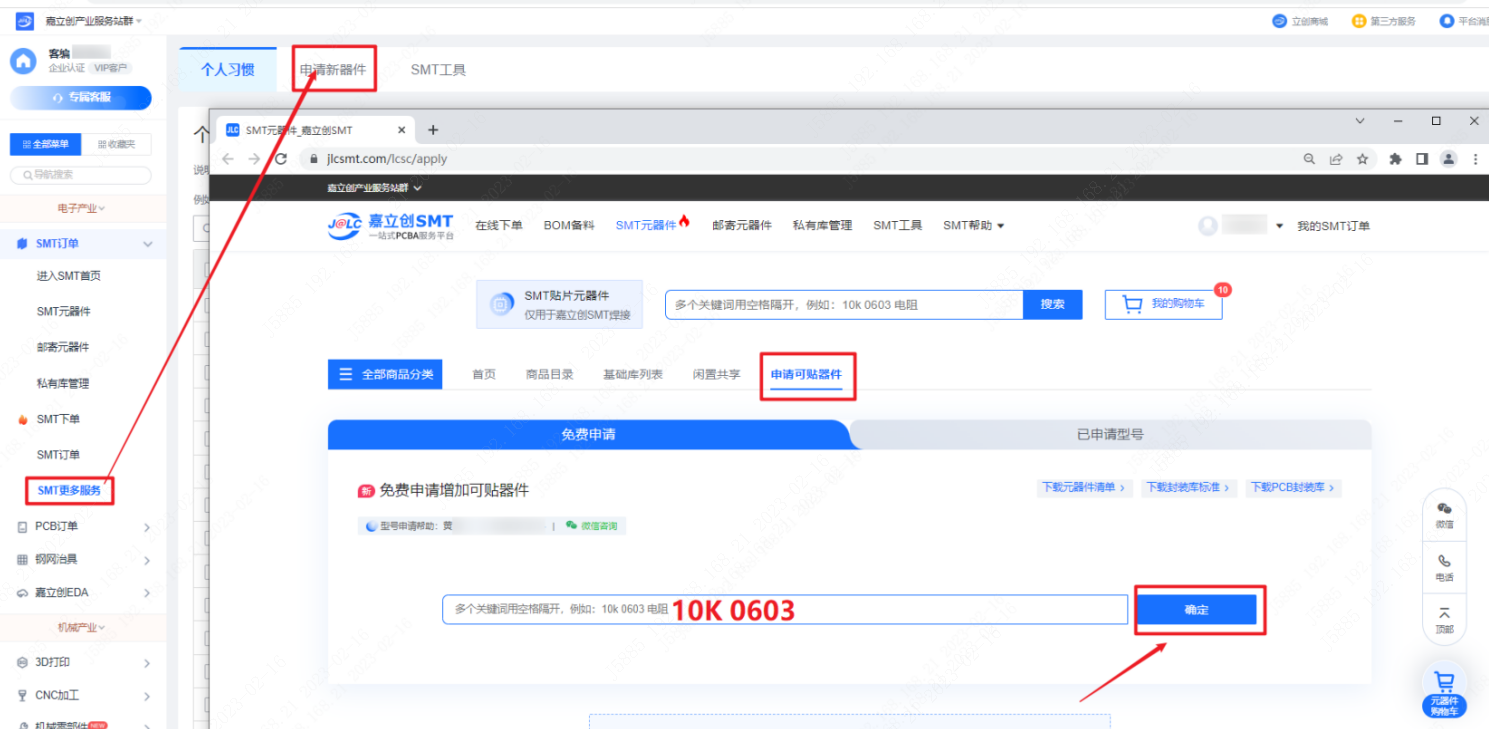 點擊【SMT更多服務(wù)】---【申請新器件】---進(jìn)入下個新網(wǎng)頁,找到【申請可貼器件】按鈕,在下方輸入框內(nèi)輸入需要的器件型號點【確定】按鈕。點【申請加入可貼列表】。