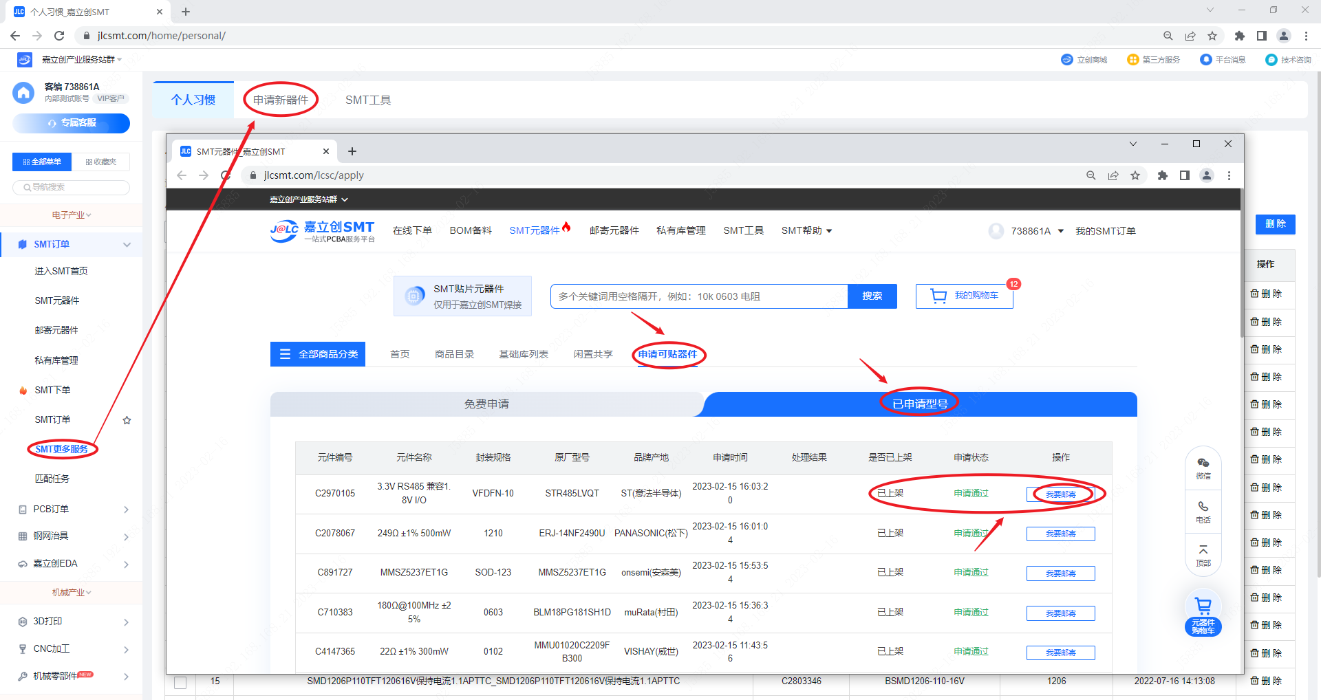對于客戶用型號申請,通過后在“待上架”的,如超過二天時間,可以在“嘉立創(chuàng)可貼器件庫存”內(nèi)找找有沒有上架。 用廠家型號申請的, 上架狀態(tài)有問題。