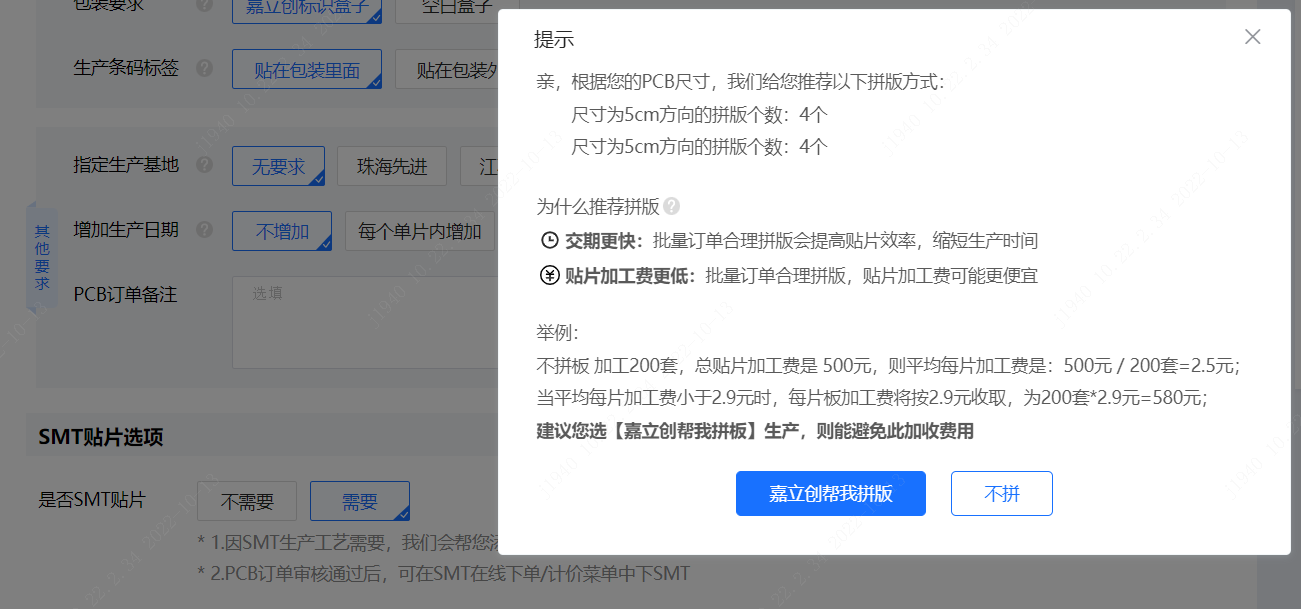 2、當(dāng)選擇需要SMT時,系統(tǒng)也會給您推薦拼版