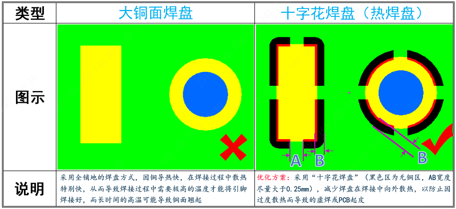 我們知道銅的導(dǎo)熱率很高(導(dǎo)熱率大概380W),因此不管是手工焊接還是回流焊,在焊接時(shí)銅面都會迅速導(dǎo)熱,而致使烙鐵等溫度流失,對焊接產(chǎn)生影響,因此設(shè)計(jì)上盡量采用"十字花焊盤"減少熱量散發(fā),方便焊接。