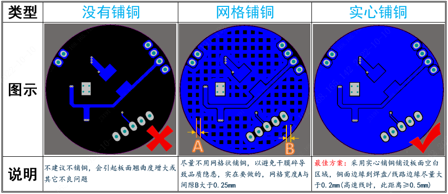 隨著PCB的高精密化以及對PCB品質(zhì)要求愈來愈高,主要PCB工廠均放棄低成本的濕膜工藝,而采用更優(yōu)良的干膜工藝,因此在設(shè)計(jì)允許的情況下,鋪銅時(shí)盡量減小網(wǎng)格鋪銅以減小干膜碎對線路產(chǎn)生影響,采用實(shí)心鋪銅就是比較好的方法