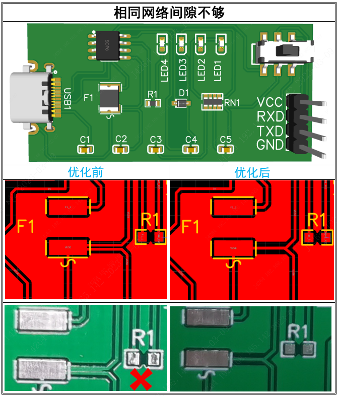 我司采用干膜工藝生產(chǎn),為避免干膜碎對(duì)PCB造成開短路的不良,對(duì)于相同網(wǎng)絡(luò)的間隙要求0.254mm(相關(guān)說明詳見下單前技術(shù)員必看)