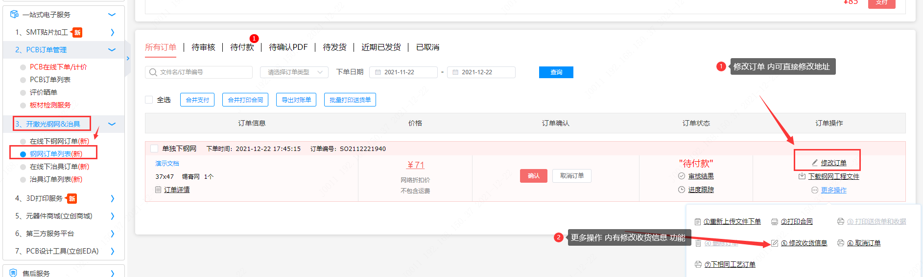1)請在【 鋼網(wǎng)訂單列表----》修改收貨地址】進行修改。所下圖所示: