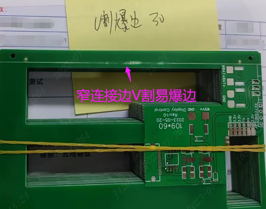 窄的連接邊V割時(shí),也易出現(xiàn)爆邊的情況,此類的板邊建議鑼邊處理(窄板邊寬2MM以上)
