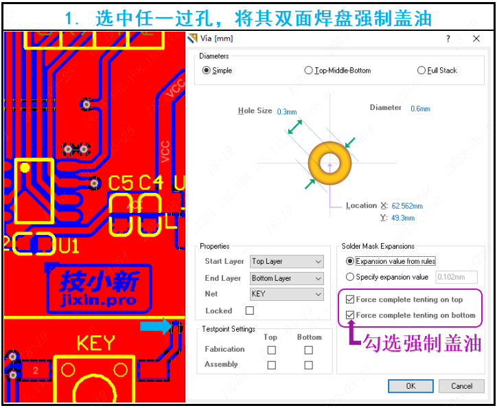 ?1. 雙擊任一過孔(via),把"Force complet tenting on top/bottom"選項前面的兩個框都勾選上:勾選了TOP表示頂層焊盤強制蓋油;勾選了BOTTOM表示底層焊盤強制蓋油