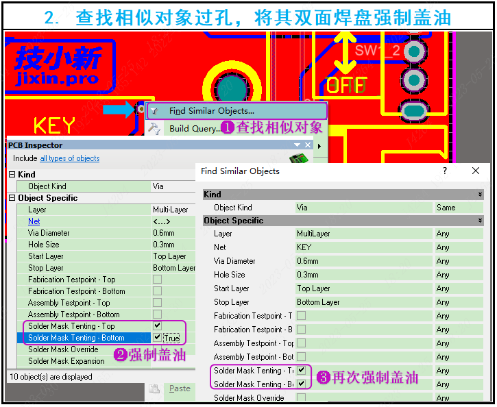 2. 右鍵單擊選擇這個過孔(via),然后選擇“Find Similar Objects”查找相似目標,再把“Solder Mast Tenting-Top/Bottom”后面的兩個框都勾選上OK確認,最后再確認選擇一遍就可以了