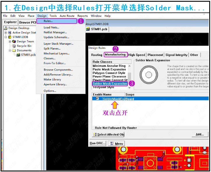 1. 打開文件,在菜單項中選擇Design-Rules,然后在新打開的菜單中選擇"SolerMaskExpansion..."雙擊點開