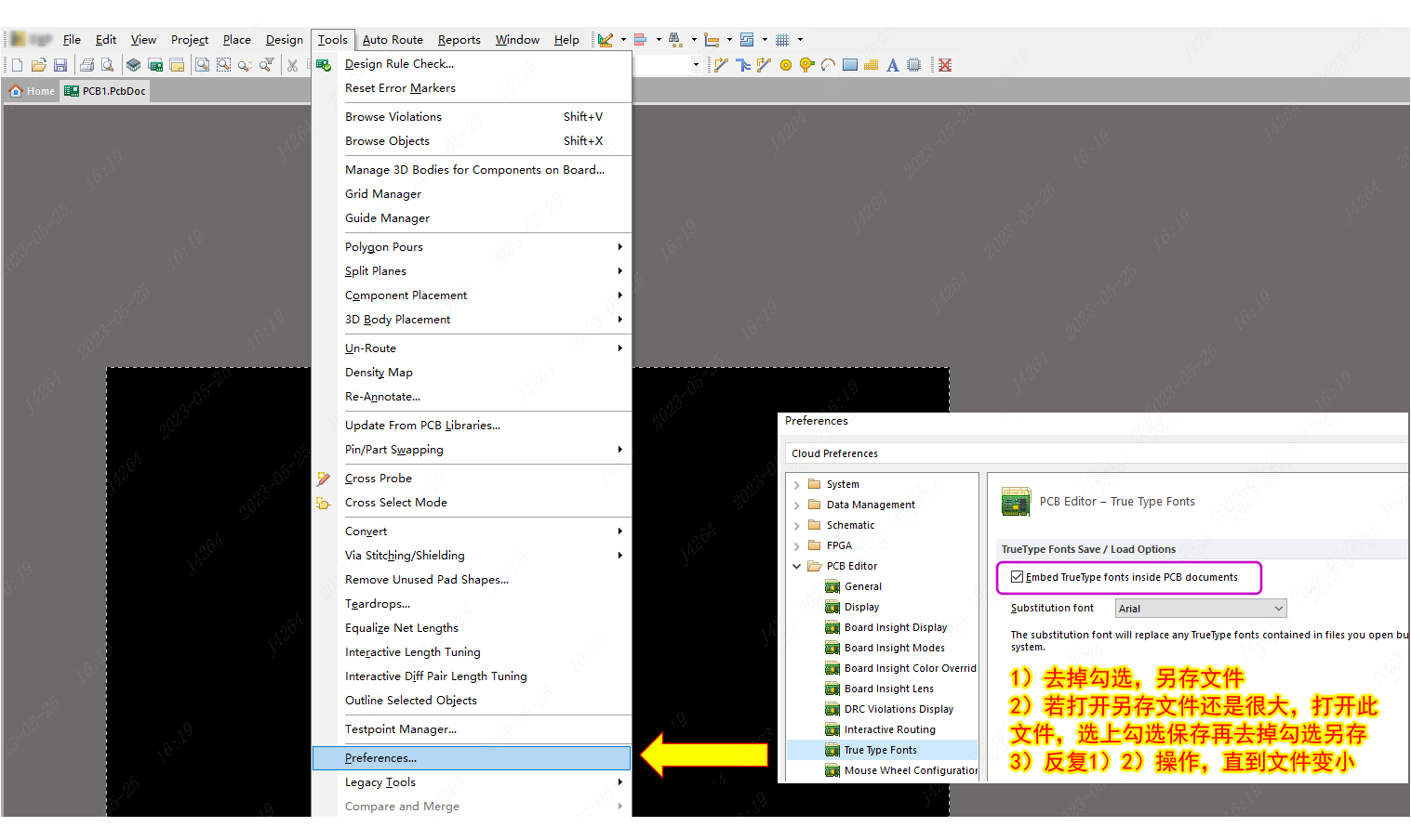 一些Altium Designer設(shè)計的PCB文件保存后文件比較大,通常是在PCB中放置了一些內(nèi)嵌字體的緣故,作用是在于讓其他并沒有安裝此類型字體的電腦可以查看到具體的字符串的內(nèi)容。