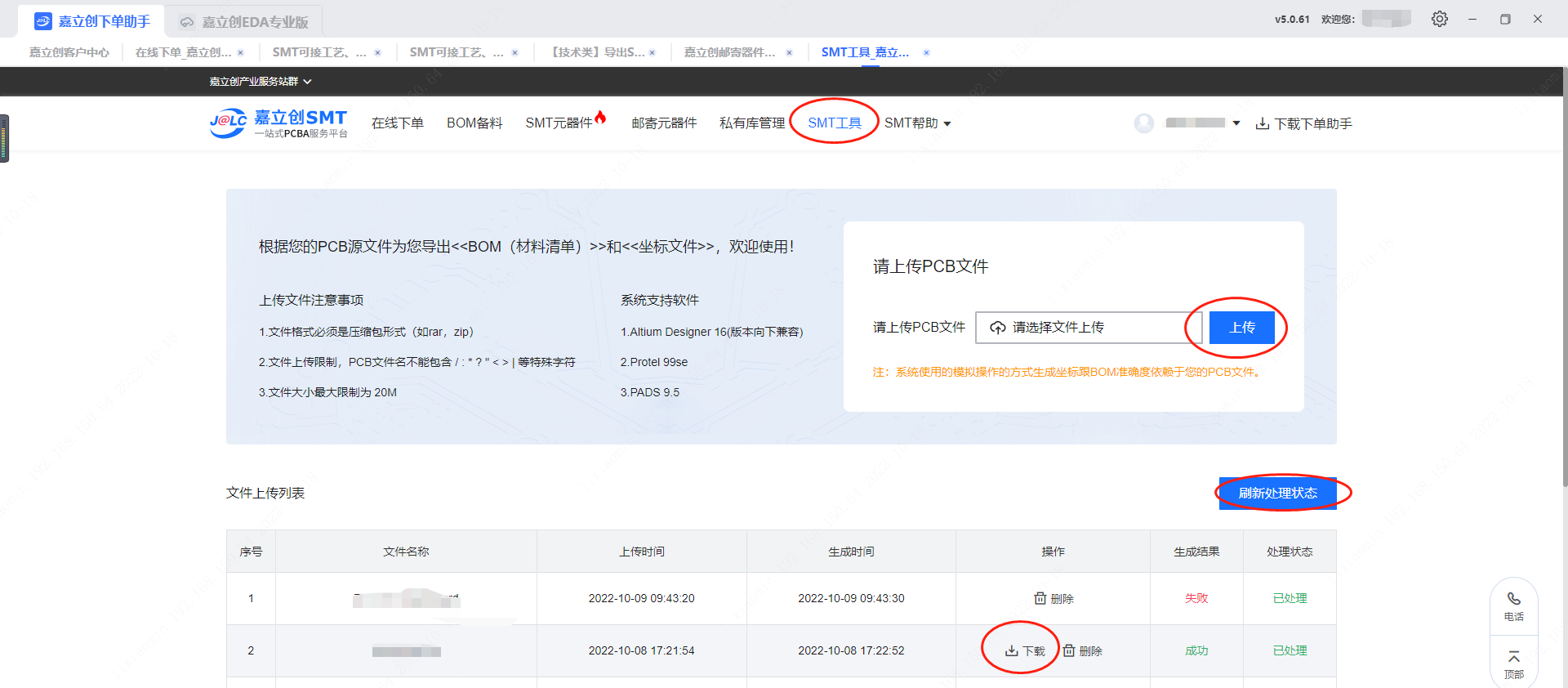 1.在【SMT訂單】--【SMT工具】中,點(diǎn)擊選擇文件,上傳PCB文件(文件名不要帶pcb字樣,否則上傳不