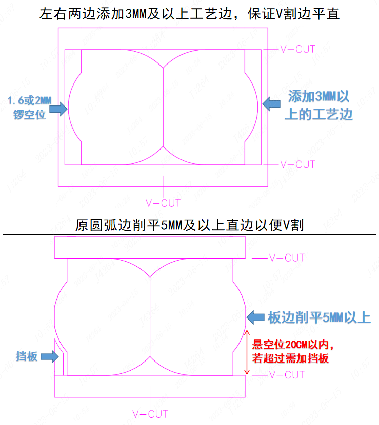 在實(shí)際生產(chǎn)中,V割加工板子類似在軌道中行動(dòng)的火車,因此需要兩邊是直邊才能V割的,相關(guān)的拼板方式請參考V割拼板