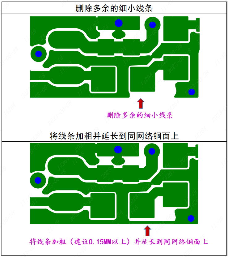 為了提供高品質(zhì)的產(chǎn)品,我司采用正片+干膜制作工藝(點(diǎn)此查看正片工藝詳細(xì)說明),可以加工更精密的線路并提供優(yōu)良的產(chǎn)品。行業(yè)中干膜工藝存在一種干膜碎,簡單的說就是很細(xì)小的線條,因附著力弱,易晃動(dòng)搭到周邊的線路或焊盤上面,從而出現(xiàn)開短路的不良情況。此細(xì)小線條大多數(shù)為軟件鋪銅或是CAM削銅后殘留的無用線條,因此設(shè)計(jì)上需要?jiǎng)h除或優(yōu)化處理。