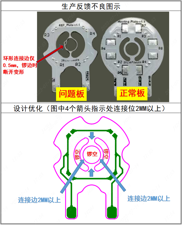 在生產(chǎn)鑼板中,對于兩邊鑼空位,中間很窄的連接邊易鑼形或斷板的,至少需要2MM以上的連接位才能保證連接上不斷開的(若板的尺寸很大,此連接邊也需要相應(yīng)的加寬)。