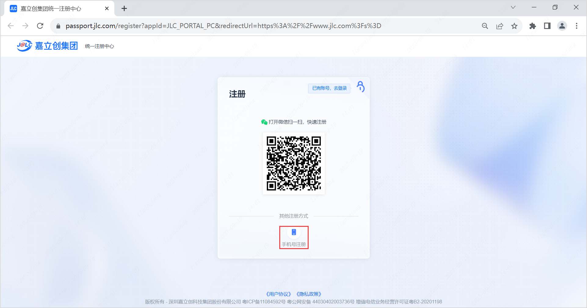 步驟 2:在統(tǒng)一注冊(cè)中心頁(yè)面, “ 其他注冊(cè)方式 ” 點(diǎn)擊 “ 手機(jī)號(hào)注冊(cè) ”;