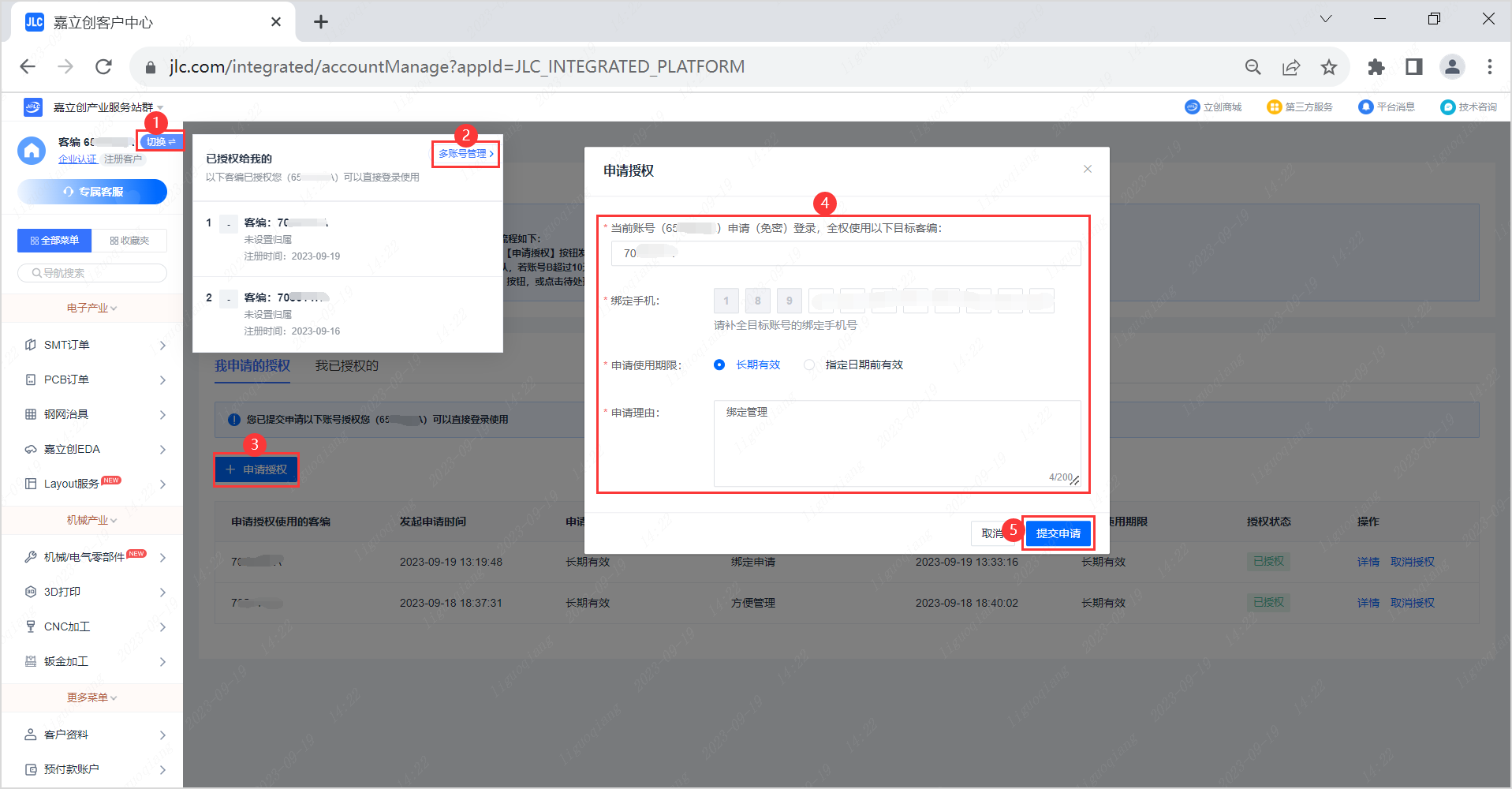 (2)在 “ 多賬號(hào)管理 ” 頁(yè)面,點(diǎn)擊 “ 申請(qǐng)授權(quán) ”,填充要綁定的申請(qǐng)賬號(hào),完善手機(jī)號(hào)碼信息,確定使用期限,補(bǔ)充申請(qǐng)理由,最后提交申請(qǐng),等待審核。