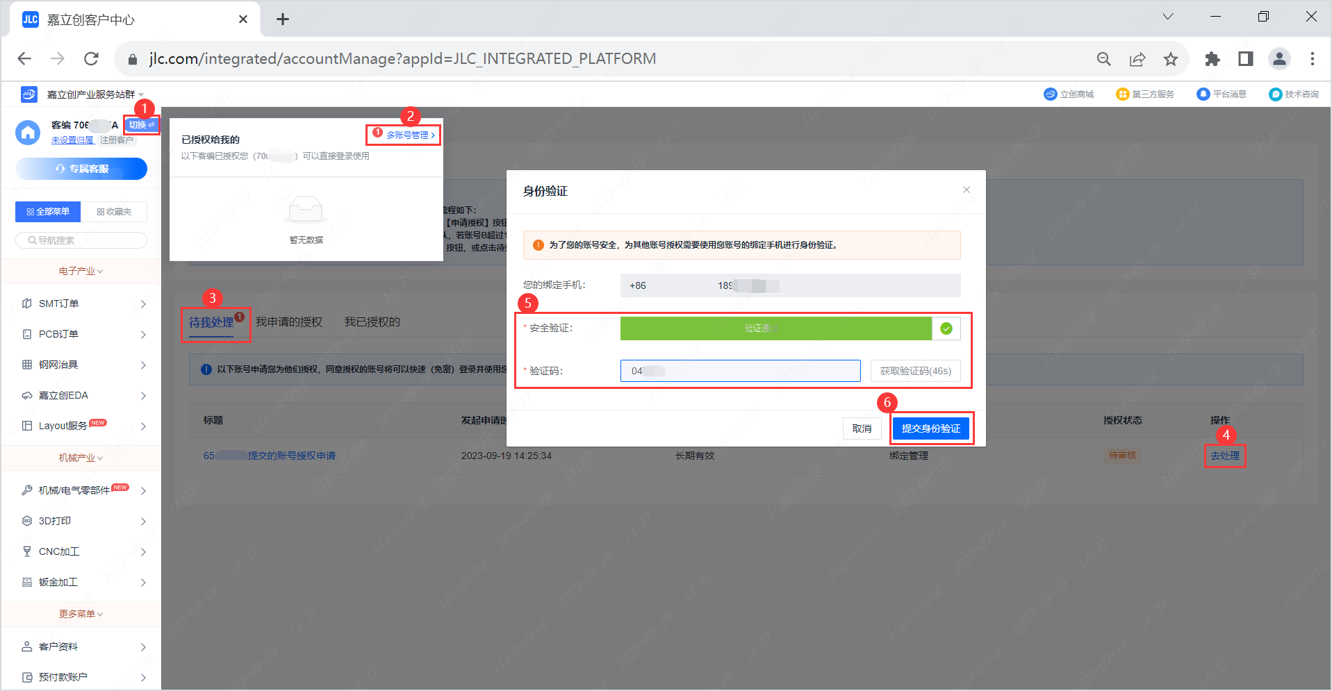 登錄被申請(qǐng)授權(quán)的賬號(hào),進(jìn)入“ 多賬號(hào)管理 ” 頁(yè)面,在 “ 待我處理 ” 中查看授權(quán)申請(qǐng),點(diǎn)擊 “ 去處理 ”,進(jìn)行身份驗(yàn)證,核對(duì)申請(qǐng)信息,進(jìn)行審核處理。