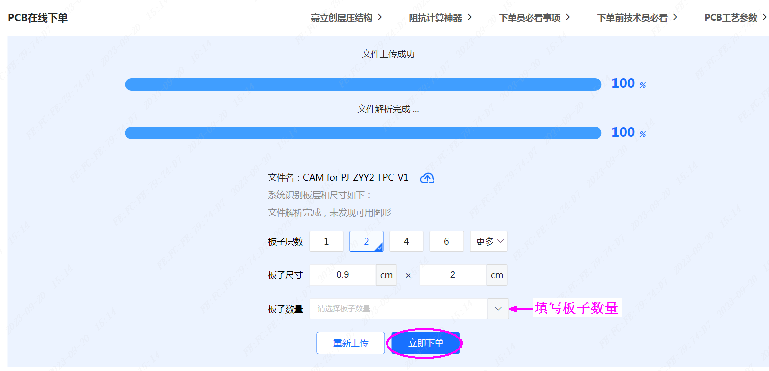 3.上傳文件后,等待文件解析,確認(rèn)板層,板尺寸填寫板子數(shù)量,再點立即下單(個別資料解析失敗,可以手動填板層,板尺寸繼續(xù)下單)